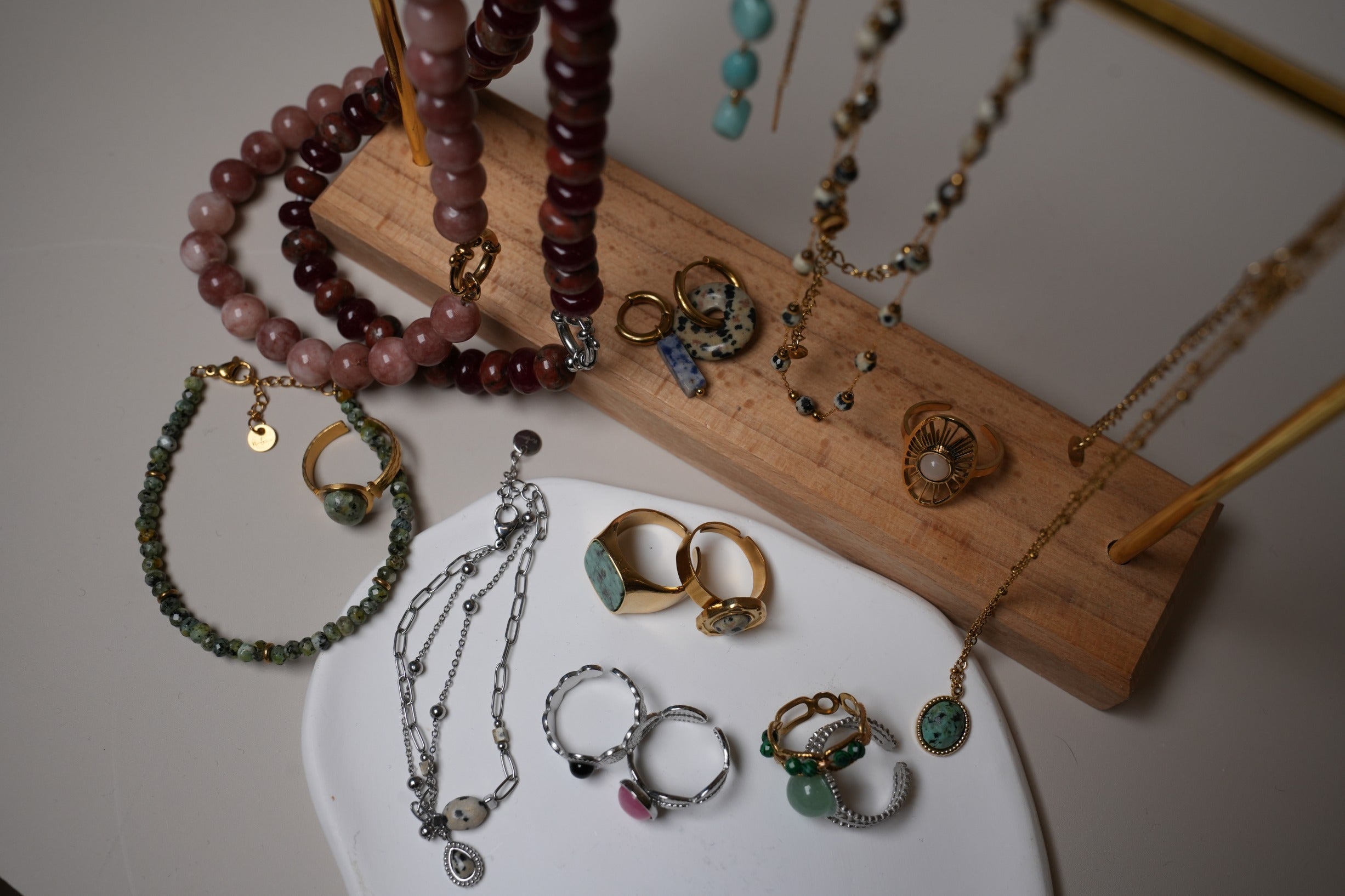 I nostri gioielli in pietra naturale sono realizzati in stainless steel, rendendoli duraturi, resistenti al colore e waterproof. Combina collane, bracciali, anelli e orecchini per un look elegante e personale che rispecchi la tua energia.